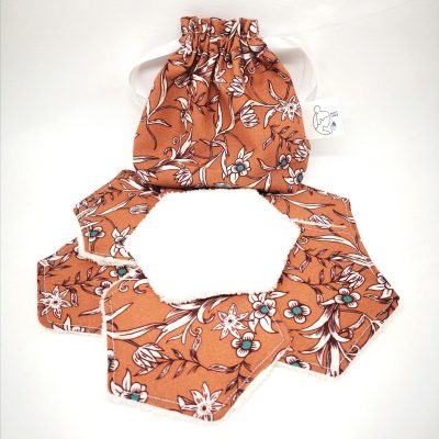 Tissu motifs graphiques marron, avec dessins floraux bleu et blanc : coton certifié Oeko-tex® Standard 100